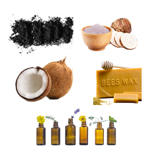 Organic arrowroot powder, organic coconut oil, organic beeswax, baking soda, grass-fed grass-finished beef tallow, kaolin clay, non-nano zinc oxide, organic vitamin E, pure essential oils, organic charcoal, rosemary extract